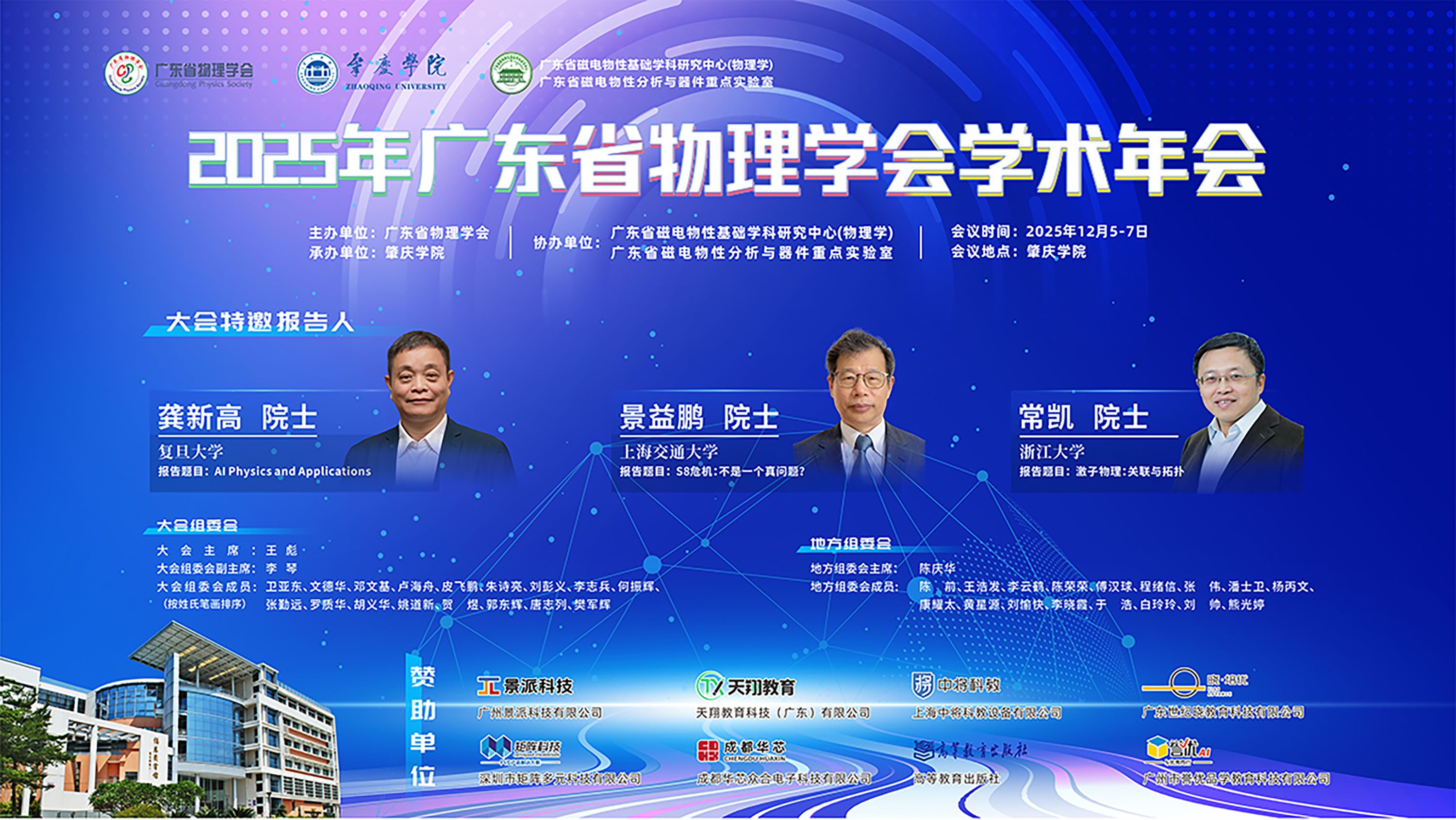 2025年12月5日至7日,我校承办的广东省物理学会学术年会在我校隆重举行。来自省内各高校、科研院所的300多名专家学者,包括龚新高、景益鹏、常凯等3名院士等齐聚我校,围绕物理学前沿理论、教学改革创新、产学研融合等热点议题展开深入研讨。学院借此机会搭建高水平学术交流平台,既展示了学院在物理学领域的教学科研成果,也为师生提供了与行业顶尖专家面对面交流的机会,有效促进了全省物理学学科的协同发展,提升了学院在省内相关领域的学术影响力。