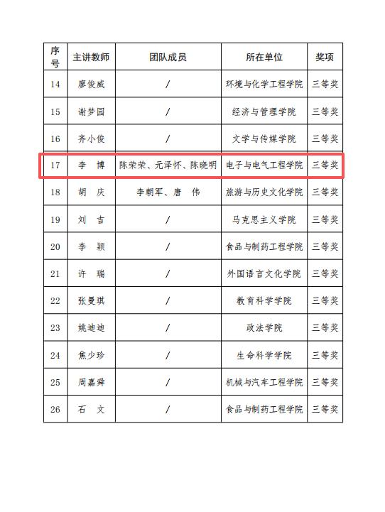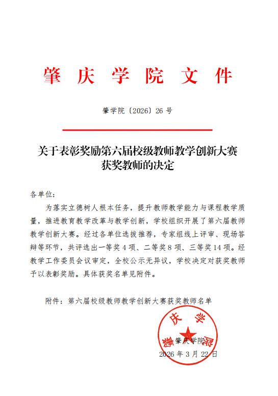 近日,肇庆学院正式发布《关于公布第六届校级教师教学创新大赛获奖名单的通知》(肇学院〔2026〕26号)我院李博老师及其团队成员凭借富有前瞻性的教学创新设计、扎实又出色的教学实践能力以及良好的课堂互动效果,从众多参赛教师中脱颖而出,荣获本次大赛三等奖。本次评选经过学院推荐、专家线上评审及现场答辩等多轮严格遴选结果。